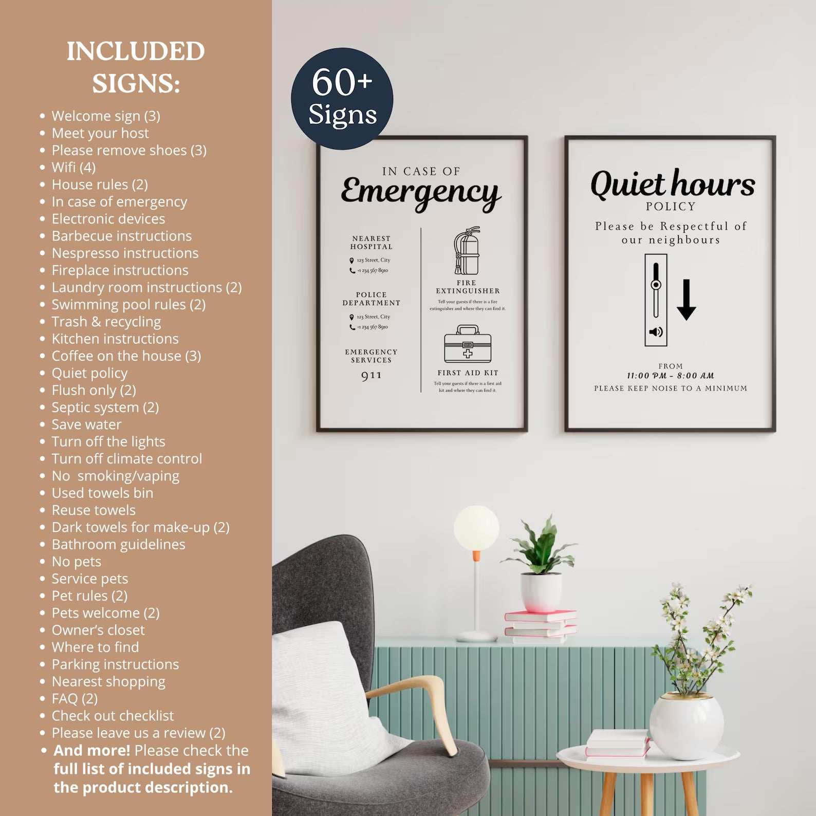 60 Editable Airbnb Signs (Sizes: US Letter, A4, 8x10", 5x7")